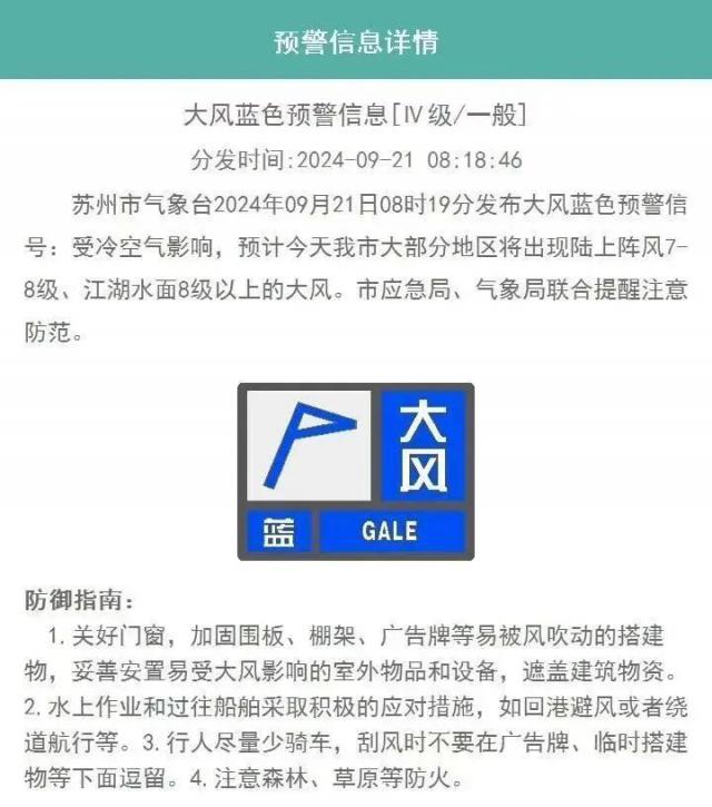 苏州气象发布大风蓝色预警信号:受冷空气影响,预计今天我市大部分地区将出现陆上阵风7-8级、江湖水面8级以上的大风。