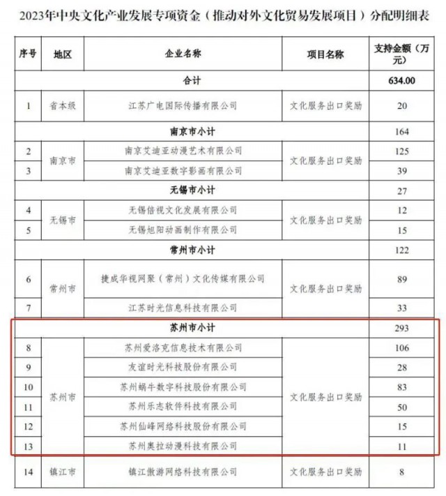近日,2023年中央文化产业发展专项资金(推动对外文化贸易发展项目)下发,苏州市共6家企业获293万元专项资金奖励,全部来自苏州工业园区,项目 ...
