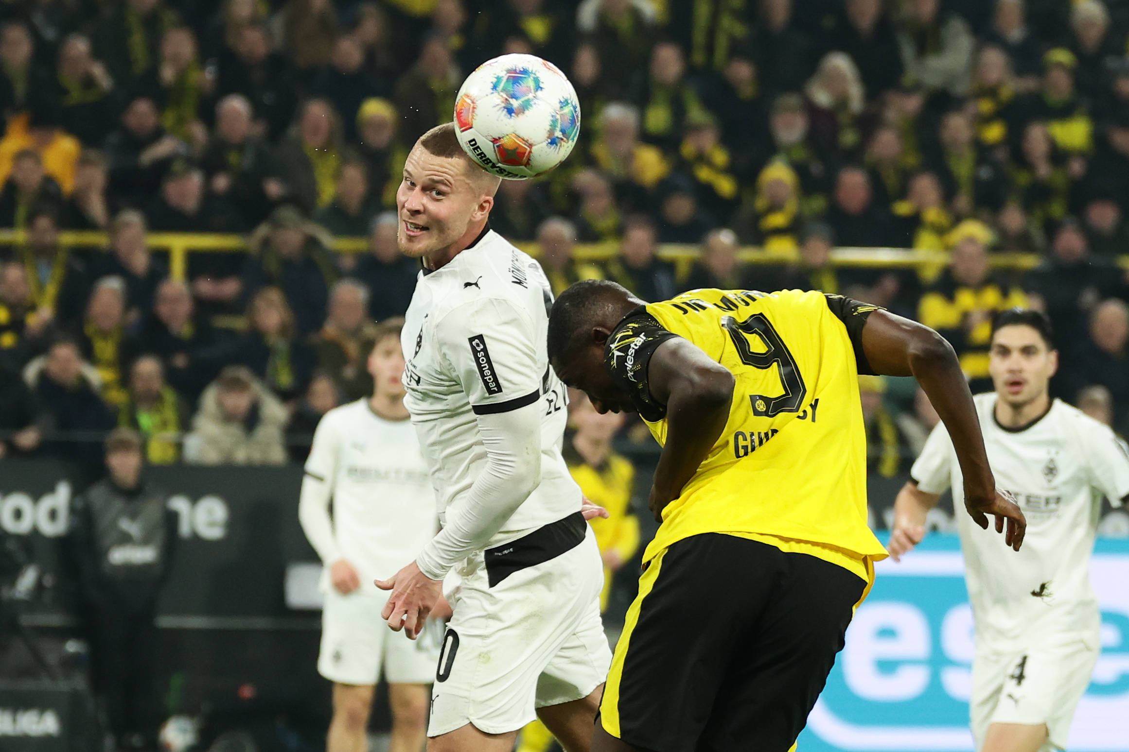 12月19日,多特蒙德队球员吉拉西(右)和门兴格拉德巴赫队球员埃尔韦迪在比赛中争顶头球。 新华社发(约阿希姆·毕瓦勒兹摄)