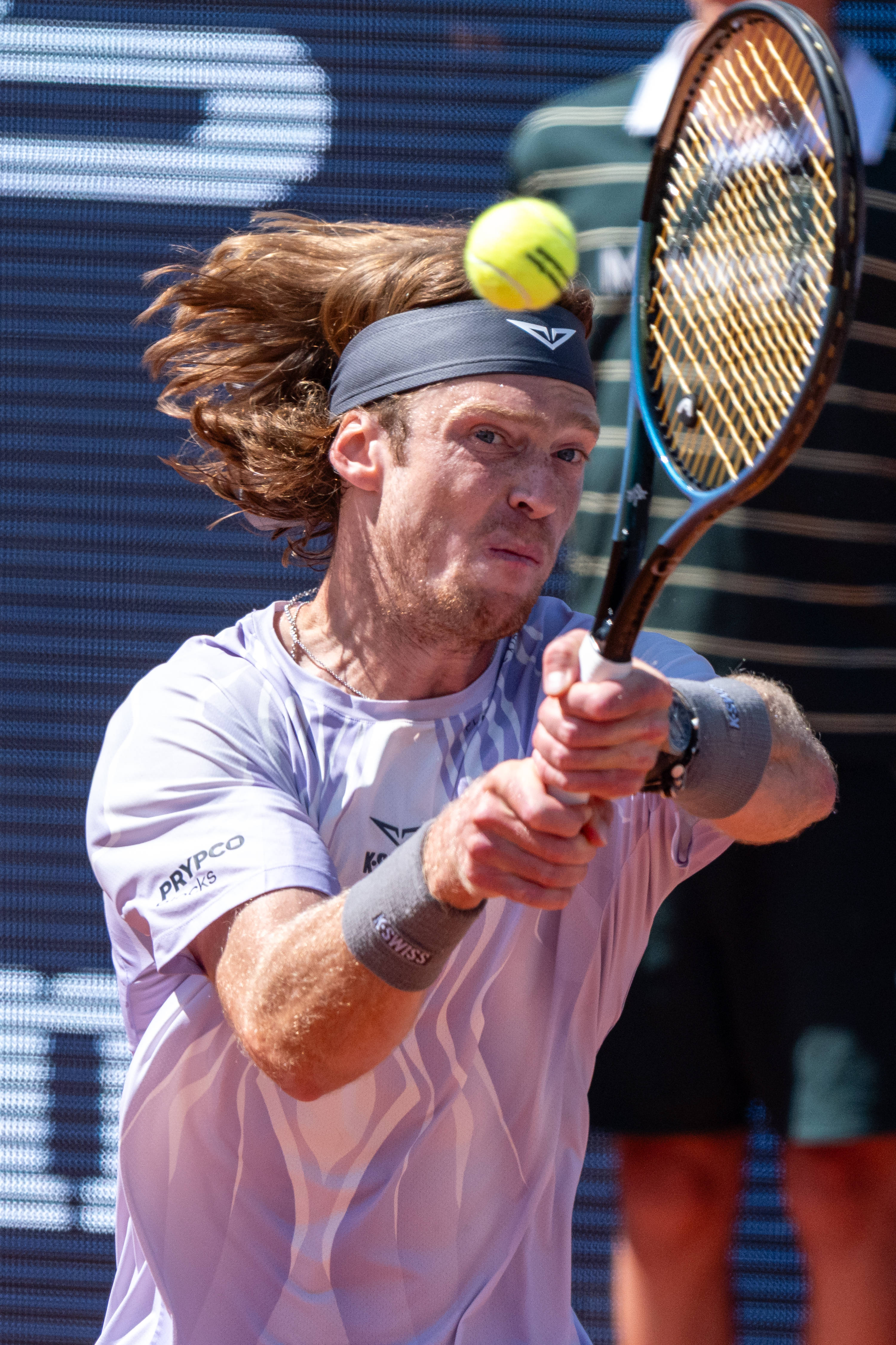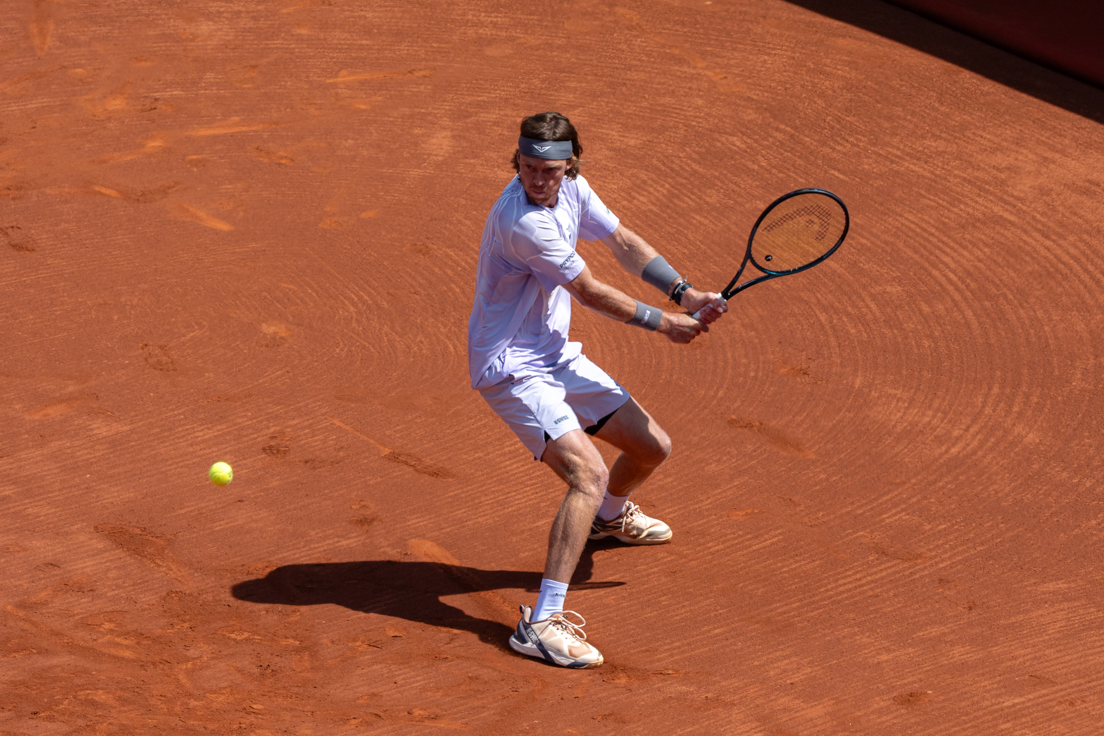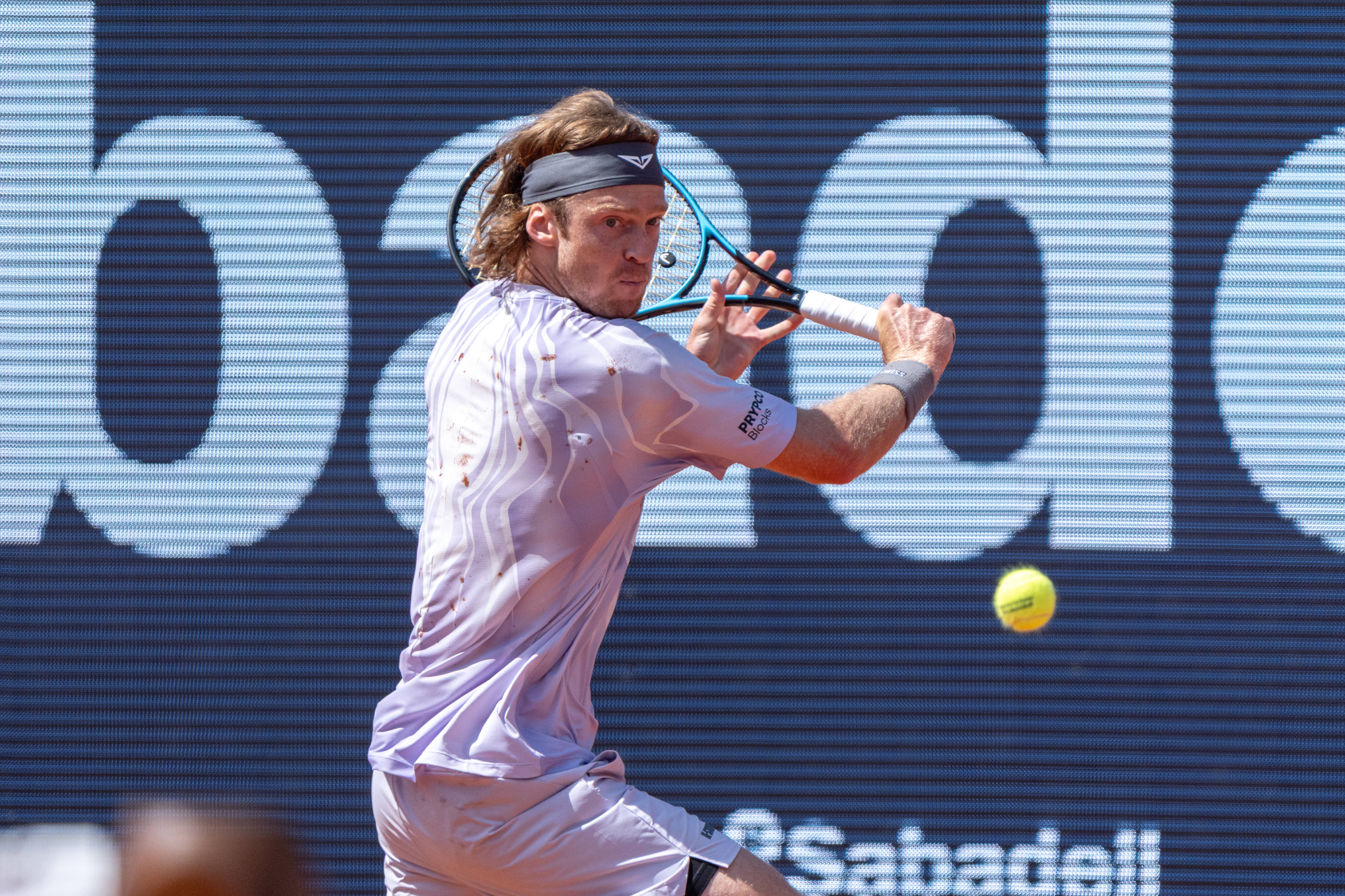 4月18日,俄罗斯选手卢布列夫在比赛中回球。 新华社发(胡安·戈萨摄)