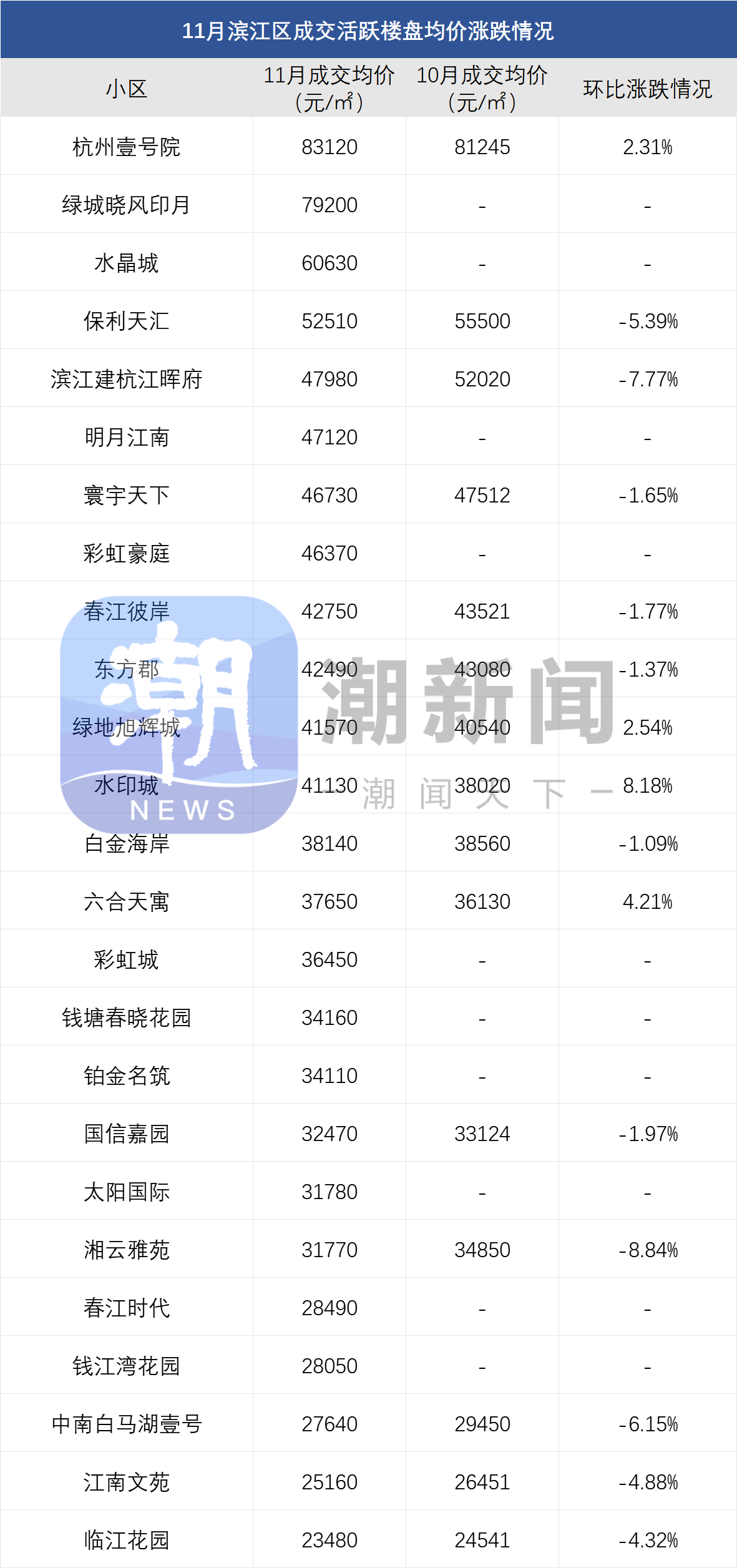 最新杭州二手房价涨跌榜:低总价房源撑起年底“翘尾”行情,最低7410元/㎡
