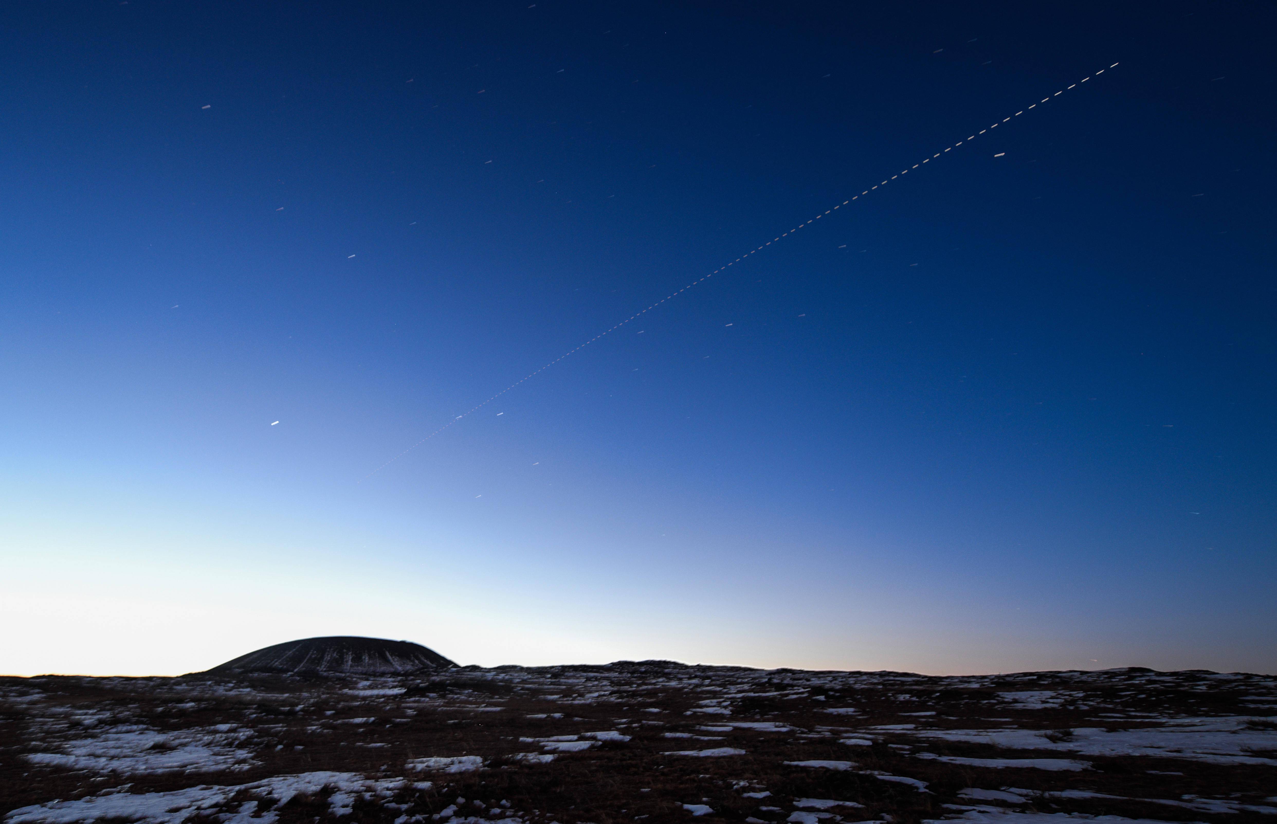 11月23日,在内蒙古自治区乌兰察布市察哈尔右翼后旗乌兰哈达火山群拍摄的中国空间站过境照片(轨迹为多张照片堆栈)。
